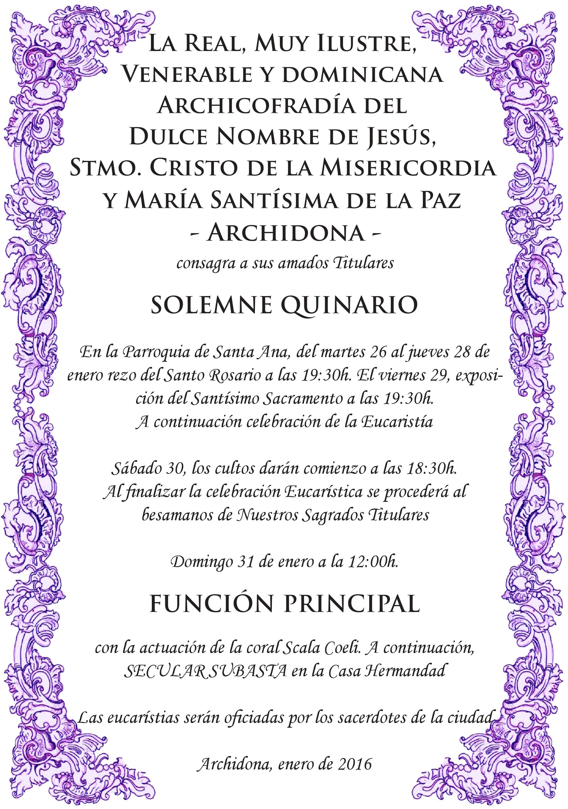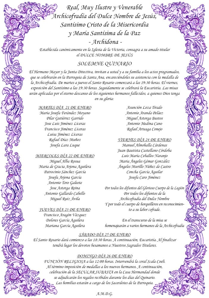 • Os recordamos a todos, que tras el quinario dedicado a nuestro Titular el Dulce Nombre de Jesús que comenzó el pasado martes, el domingo tendrá lugar la Función principal a las 1 de la tarde en la Iglesia de la Victoria. Tras la misma se impondrán las medallas de la Archicofradia a los nuevos hermanos que así lo deseen. Los interesados deben ponerse en contacto con Mariola González en paseo de la Victoria 9 para solicitarlo. Al término de la Eucaristía se celebrará nuestra secular subasta con los regalos que los hermanos entregan durante estos días en el cancel de la Iglesia