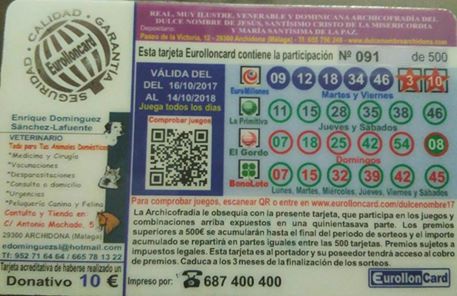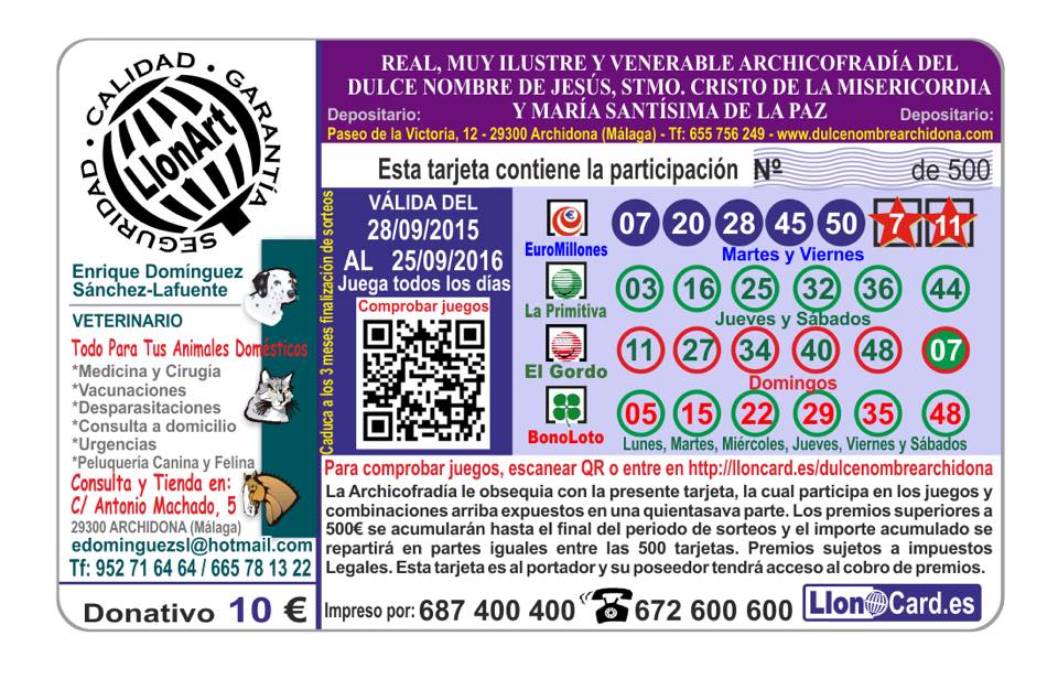 • Ya tenemos nuestras tarjetas preparadas!!! Por tan sólo 10€ de donativo, podrás participar en todos los sorteos semanales que indica el reverso de la tarjeta y durante un año entero!!! ¿A que esperas? Si deseas adquirir alguna ponte en contacto con nosotros. SUERTE!!