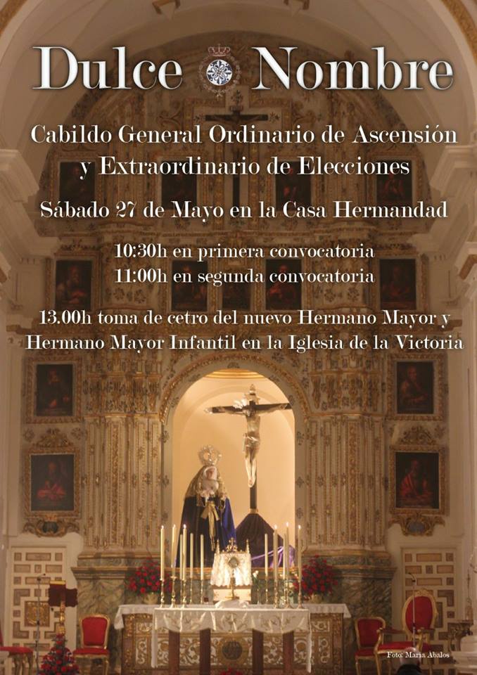 • El sábado tuvo lugar el Cabildo de Elecciones de la Archicofradía del Dulce Nombre, en la cual tomaba posesión el nuevo Hermano Mayor, Manuel Astorga Murillo. Igualmente se procedió al relevo en la sección infantil, siendo la nueva Hermana Mayor del Dulce Nombre Chiquito la cofrade Carolina García Jiménez. En el transcurso del cabildo se procedió a nombrar al nuevo Sampedro del Dulce Nombre Chiquito, Antonio Gémar Cuesta. Por su parte, la camarera del Dulce Nombre, Rosa Carrera, presentó su renuncia al cargo después de tantos y tantos años cerca del Señor. Finalmente, se celebró la ceremonia de toma de cetro en el Altar Mayor de la Iglesia de la Victoria, ante nuestros Sagrados Titulares, que culminó con una estupenda y abundante copa en la Casa Hermandad para celebrar tan magno día. Damos la enhorabuena al nuevo Hermano Mayor, así como las gracias a Eusebio Córdoba por los cuatro años que ha estado al frente de esta gran Archicofradía.