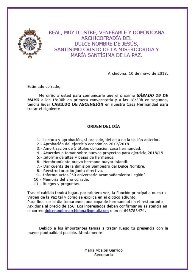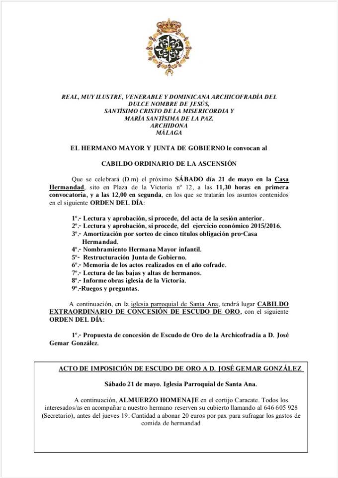 • Se convoca a todos los hermanos de la Archicofradía al Cabildo general ordinario y extraordinario de elecciones el próximo sábado día 27 de mayo.