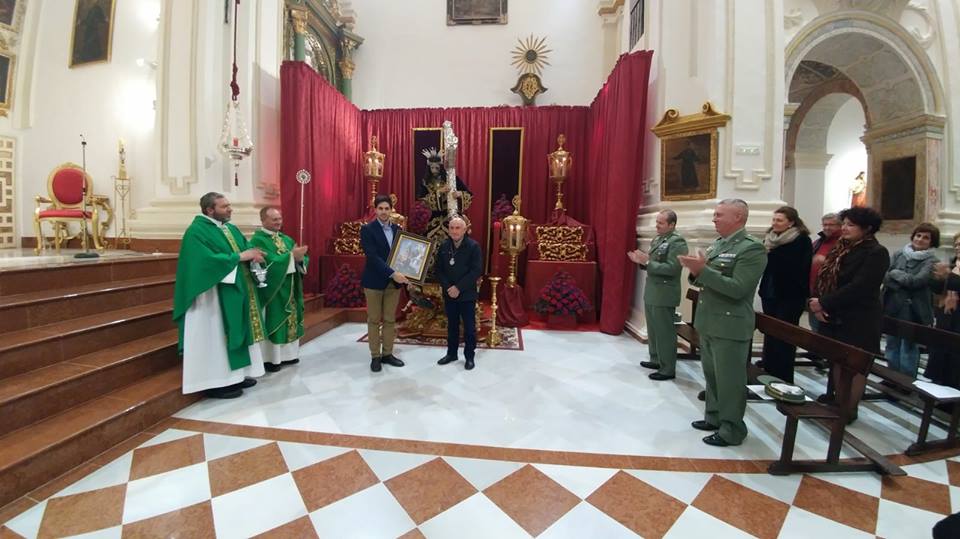 En la noche de ayer viernes el teniente coronel jefe de la X bandera de la Legión D. Antonio Ferrera y el comandante D. José Luis Gutierrez quisieron acompañarnos,como todos los años, junto a sus familias en nuestra misa de quinario. Además tras la Eucaristía, que fue oficiada por el capellan castrense junto a nuestro Vicario parroquial Marcos, D. Alvaro Gutierrez, joven compositor y músico de la banda Cigarreras de Sevilla, quiso regalar las partituras de la marcha 'Dulce Nombre Legionario' que ha compuesto para nuestro Titular y que podremos escuchar el próximo Viernes Santo.