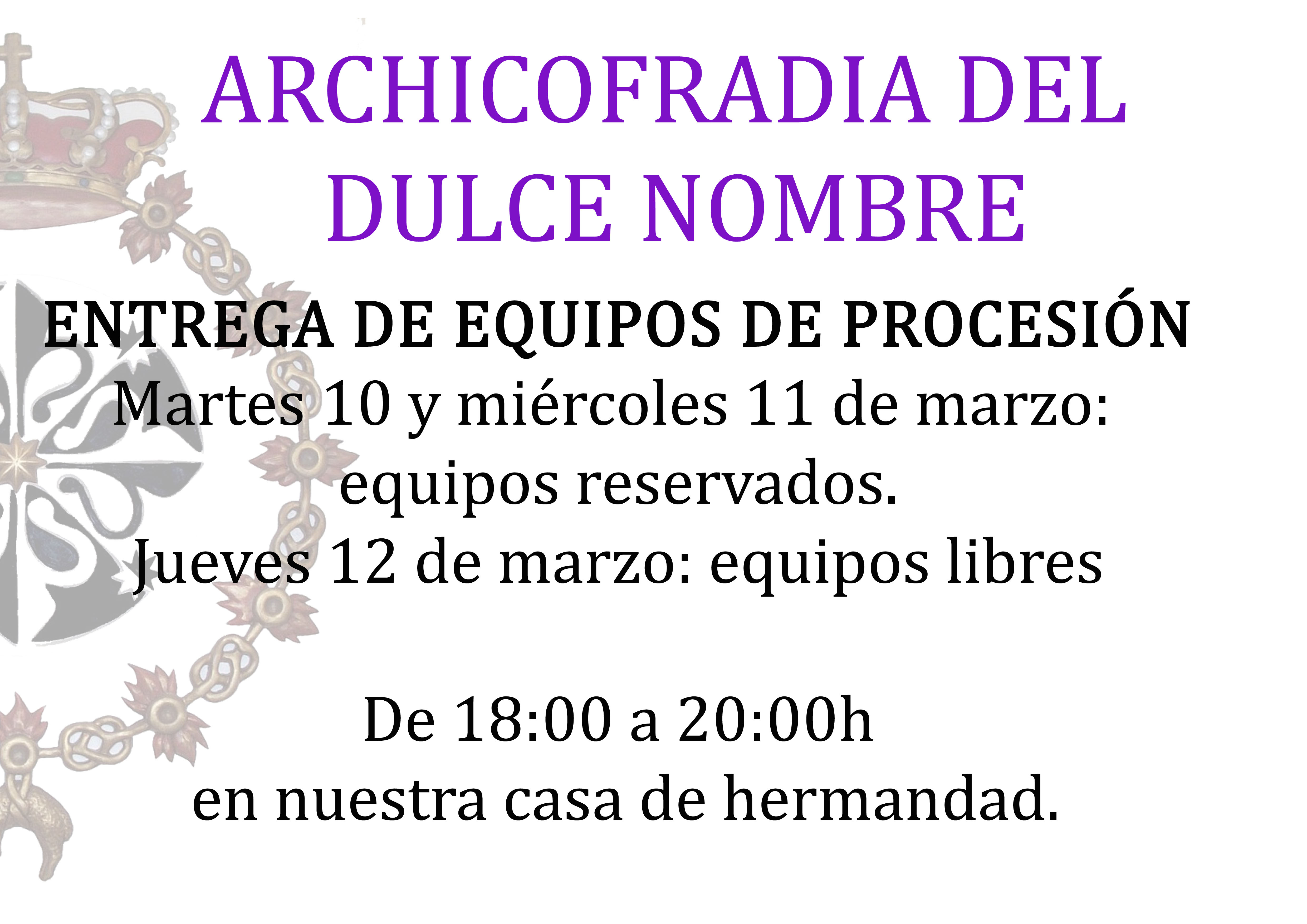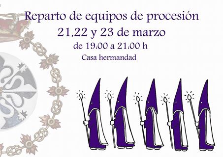 Mañana Viernes día 2 de marzo de 18:00 a 20:00h y el sábado día 3 de 12:00 a 14:00h, reparto de equipos de procesión en nuestra casa de hermandad. Si posees equipo en propiedad y vas participar en la procesión, ponte en contacto con nosotros para reservar sitio.
