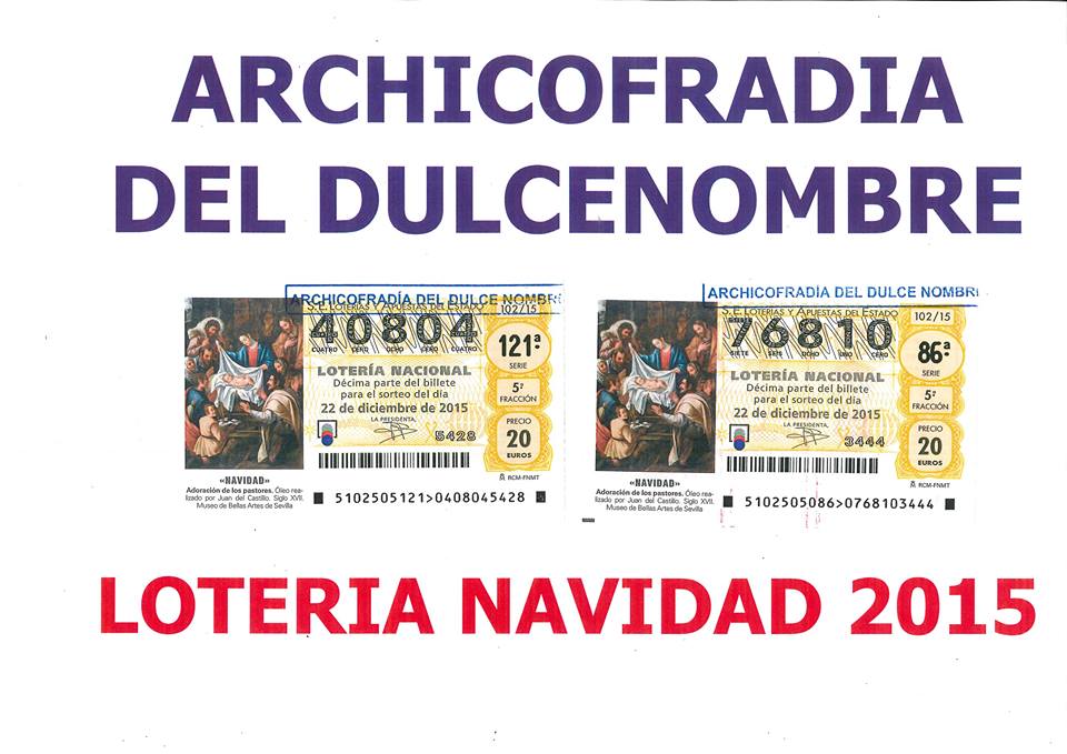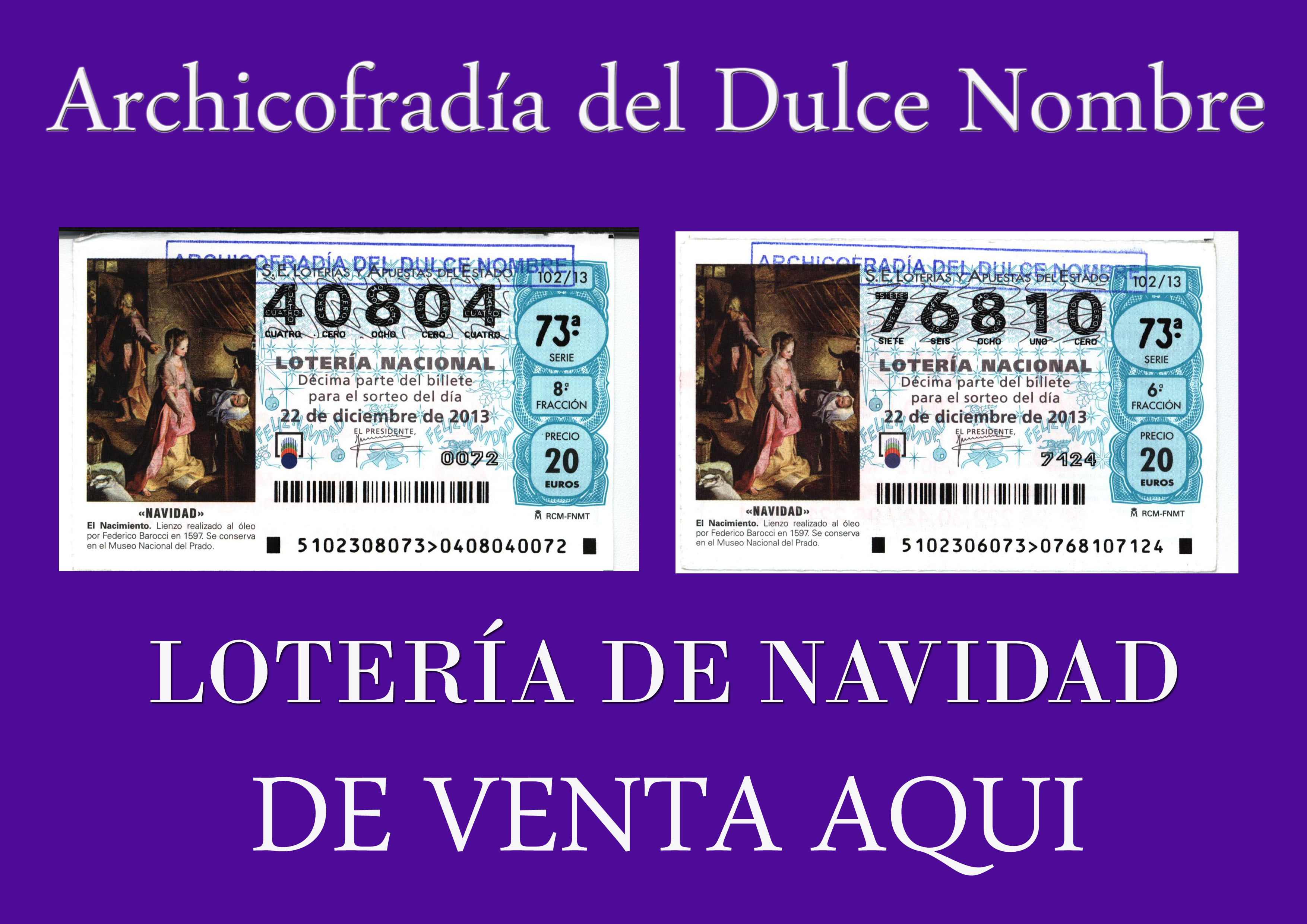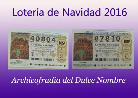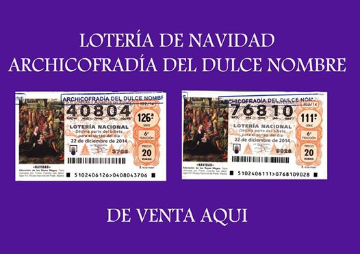 Ya está a la venta la lotería de navidad de la Archicofradia del Dulcenombre. Si desea adquirir alguno de estos números, debe ponerse en contacto con Pedro Romero al número 655756249 o con Alberto Arjona al número 657611472/646605928. !Suerte a todos¡