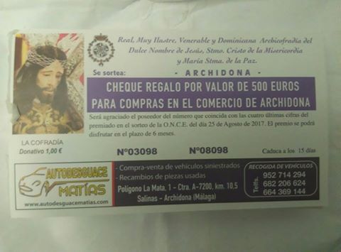 • Ya está a la venta la rifa para poder te llevarás 500€ para gastar en los distintos comercios de Archidona. Las puedes encontrar en diversos establecimientos o pregunta a los miembros de la junta directiva de la Archicofradía. El sorteo será el próximo 25 de agosto.