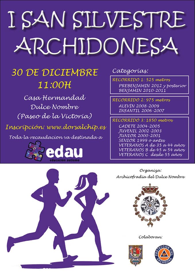 • Os anunciamos que la Archicofradía del Dulce Nombre va a organizar la primera SAN SILVESTRE en Archidona! Pronto os iremos informando de las bases, recorrido y etc . Por ahora, anotad en vuestras agendas el domingo 30 de diciembre. Todo lo recaudado será con fines benéficos.