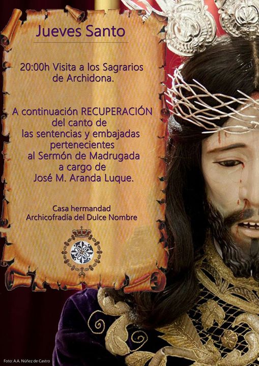 Este viernes día 4 a las siete de la tarde tendrá lugar en la Casa Hermandad de nuestra archicofradía una ponencia que tratará sobre dos de las tradiciones que vamos a recuperar, por un lado el portar al Dulcenombre “a correón”, que se estrenará en el traslado de este año el día 11 de abril; y por otro las “Sentencias y embajadas al Dulcenombre”, que se pretende recuperar para el año próximo.