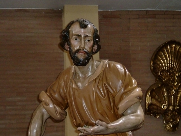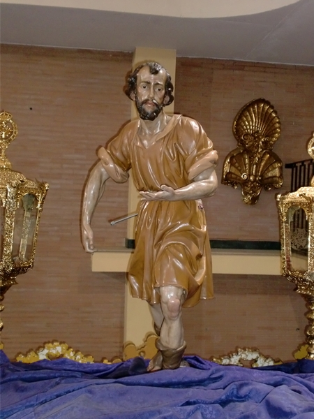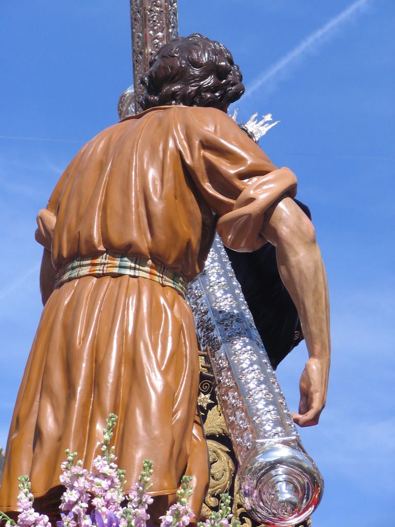 La Imagen del Cirineo fue añadida en 1921, aunque consta que ya en 1899 existía la intención de haberlo hecho. Es una talla de Pío Mollar, realizada en sus talleres de Valencia, de cuerpo entero y de corte naturalista; reduce su estatura a fin de acomodarlo para sostener el peso de la cruz. Tiene bien detallados los músculos de sus extremidades, creando una fuerte tensión en los mismos, lo que confiere veracidad al acto de portar el peso. Los ropajes tallados, al igual que el rostro un poco ovalado, pero de facciones algo más curvadas, contrastan con los planos secos del rostro del Cristo. . |